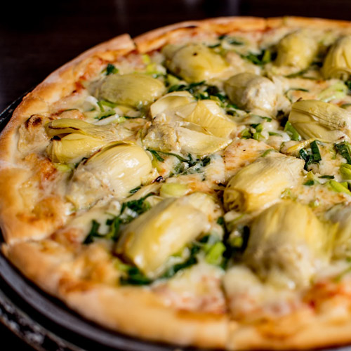 Molho de tomate, mozzarella, cebolas, alcachofras, cogumelos paris e alho poró.