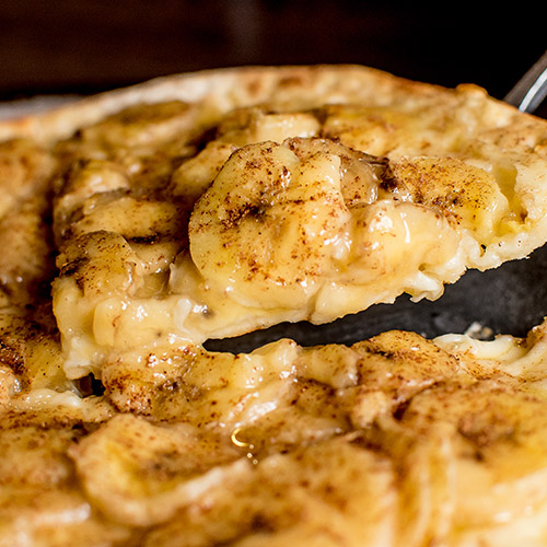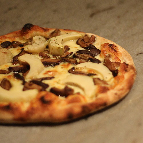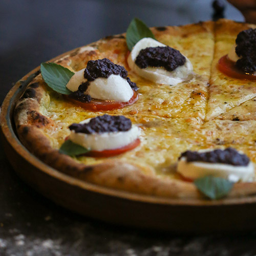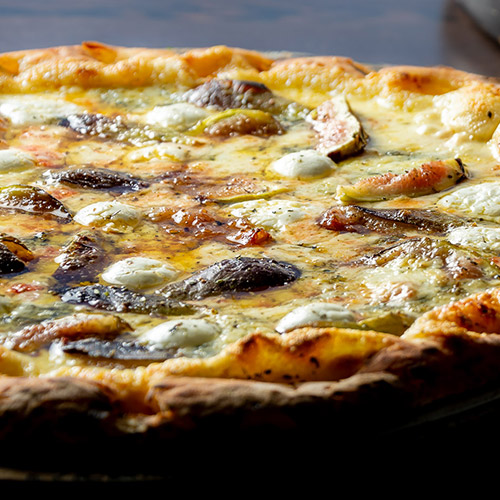 Molho de tomate, mozzarella, gorgonzola, queijo de cabra, figo, com um toque de trufas brancas.