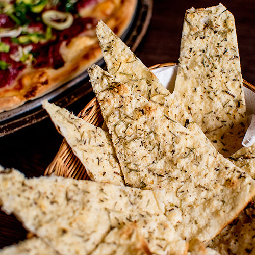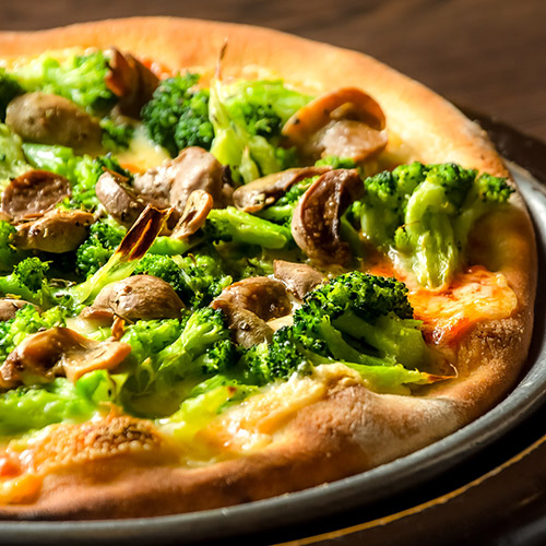 Molho de tomate, mozzarella, brócolis, cogumelos paris salteados na manteiga e crispy de alho.