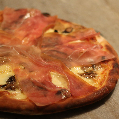 Molho de tomate, mozzarella, shitake, shimeji, cogumelos paris, queijo brie e prosciutto di Parma.