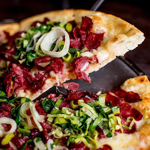 Molho de tomate, mozzarella de búfala, calabresa de javali e alho poró.