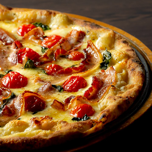 Molho de tomate, cream cheese, mozzarella, tomate cereja, manjericão e bacon.
