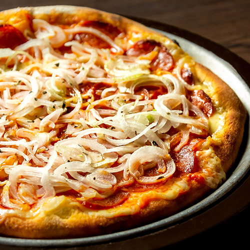 Molho de tomate, mozzarella, fatias de pepperoni e finas rodelas de cebola.