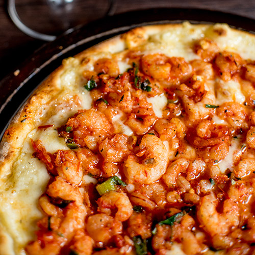 Molho de tomate, mozzarella, camarões no molho vermelho, Catupiry e parmesão.