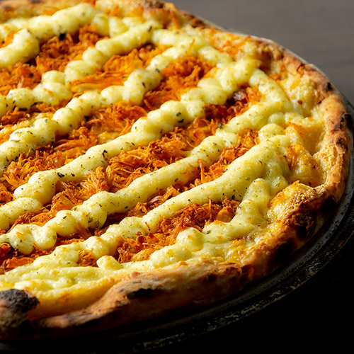 Molho de tomate, mozzarella e peito de peru finalizado com Catupiry.