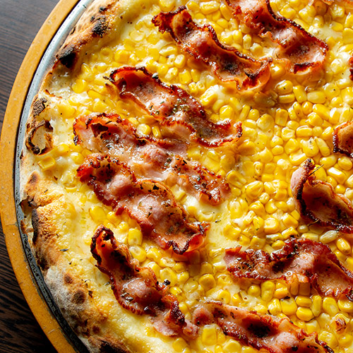 Molho de tomate, mozzarella, milho e bacon fatiado.