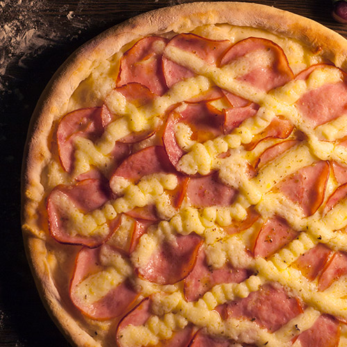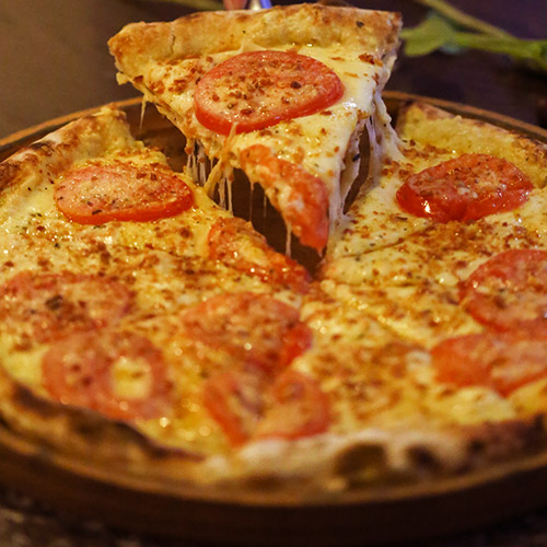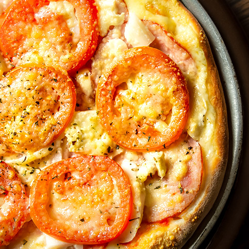 Molho de tomate, mozzarella, lombo, palmito e tomate finalizado com queijo parmesão.