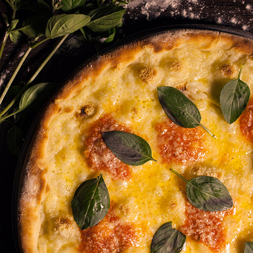 Molho de tomate, mozzarella de búfala em bola, calabresa maçarico e folhas frescas de manjericão.