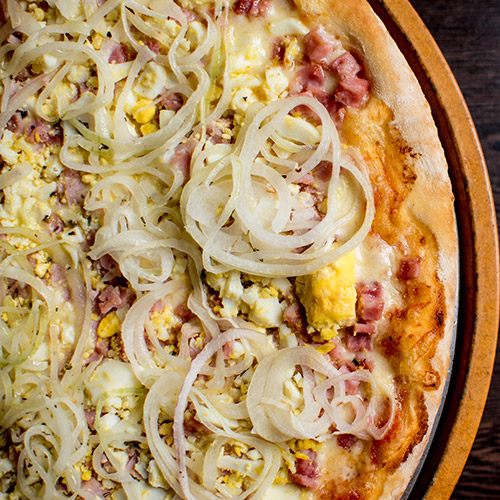 Molho de tomate, mozzarella, presunto, ovos cozidos e cebolas em rodelas.