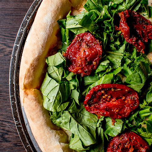 Molho de tomate, mozzarella de búfala e folhas de rúcula finalizadas com tomate seco.