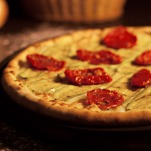 Molho de tomate, mozzarella de búfala, tomate seco e abobrinha grelhada ao azeite e finalizada com queijo parmesão.