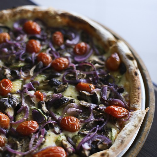 Molho de tomate, mozzarella, rodelas de abobrinha, cebolas roxa, mix de cogumelos, tomate cereja e zaatar.
