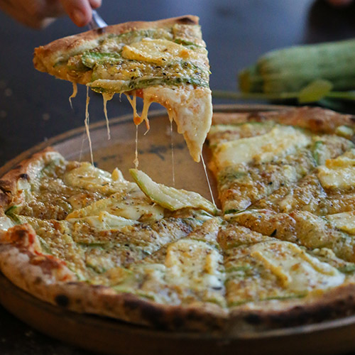 Molho de tomate, mozzarella de búfala, abobrinha italiana, queijo brie e queijo parmesão.